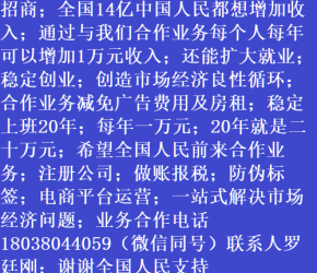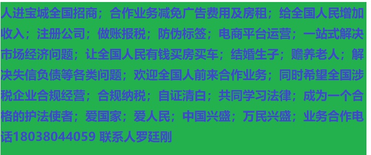 人進寶城全國招商;合作業(yè)務減免廣告費用;歡迎全國涉稅企業(yè)前來合作;業(yè)務合作電話 18038044059 聯(lián)系人羅廷剛